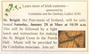 The parish will have a Mass in honor of St Brigid of Ireland. The readings, hymns and prayers will be in English and Irish. There will be a short talk during lunch about the life of St Brigid. All are invited to attend the Mass and reception that follows. Location: Main St. Danbury, CT .