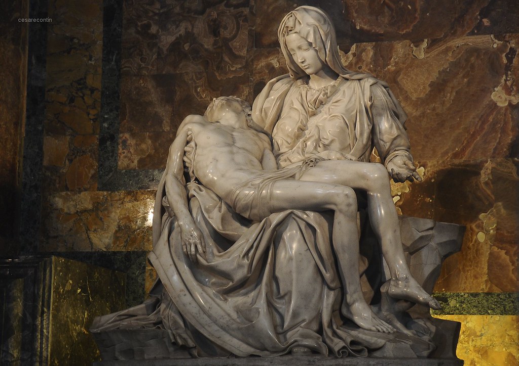 If you enter St. Peter’s Basilica in the Vatican through the doors on the right, you won’t go far before you pass by one of the most beautiful, moving sculptures in Western art: Michelangelo’s Pietà. The sculpture depicts the Virgin Mary looking down at the dead body of her son as he is draped over her lap. Her expression is a mixture of sorrow and contemplation, of mourning and acceptance. She isn’t weeping; she is gazing intently, as if she were waiting for something to happen.